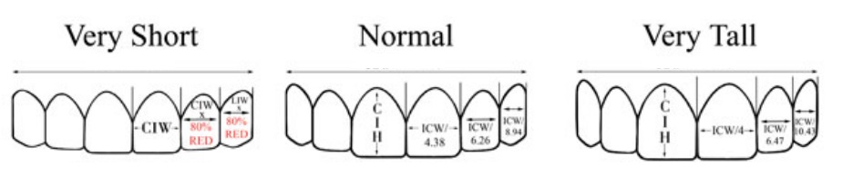 دندانهای خیلی کوتاه، عرض بینکانین نمای فرونتال ۶ دندان قدامی بر 4.8 تقسیم میشود تا عرض ایدهآل ثنایای مرکزی محاسبه شود، و نسبت RED 80 درصد برای محاسبه عرض نمای جلوی دندان های ثنایای جانبی و دندان نیش استفاده می شود .