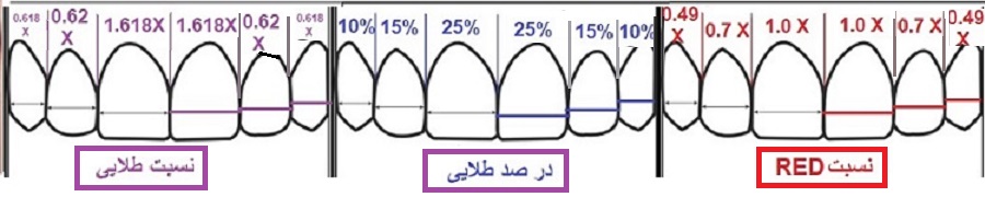 (عرض نمای جلوی 6 دندان قدامی) / 2(1+RED+RED*RED) = عرض ثنایای مرکزیRED به صورت اعشاری کمتر از 1 بیان می شود.