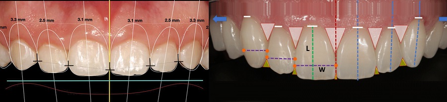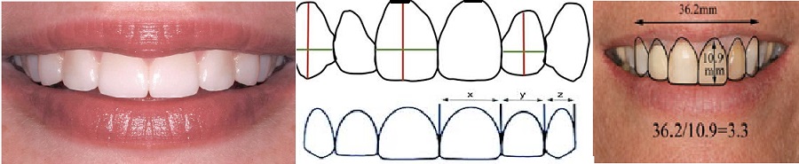 اولین قدم در تعیین ابعاد صحیح دندان این است که ببینیم دندان های مرکزی در رابطه با سایر ویژگی های صورت چگونه به نظر می رسند.