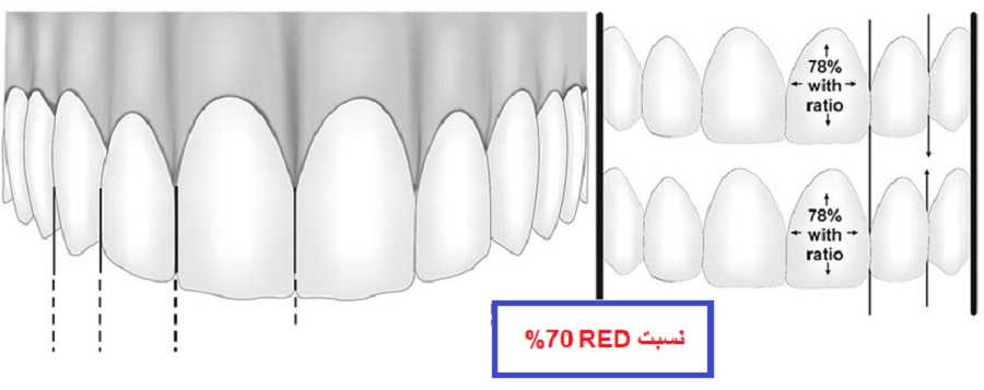 با دندانهای بسیار بلند، عرض نمای جلویی بین دندانهای 6 دندان قدامی بر 4.0 تقسیم میشود تا عرض ایدهآل ثنایای مرکزی محاسبه شود و نسبت RED 62 درصد برای محاسبه عرض نمای جلوی دندان های ثنایای جانبی و دندان نیش استفاده می شود .