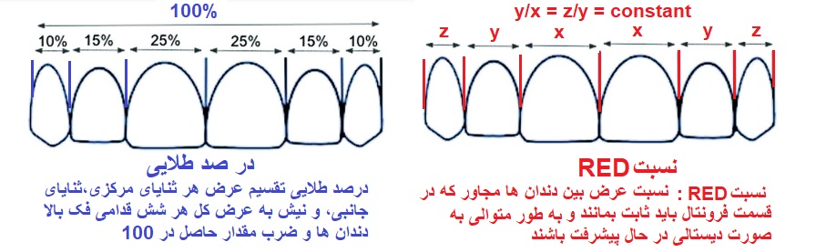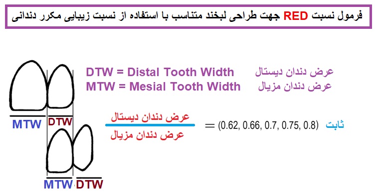 (عرض نمای جلوی 6 دندان قدامی) / 2(1+RED+RED*RED) = عرض ثنایای مرکزیRED به صورت اعشاری کمتر از 1 بیان می شود.
