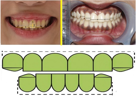 با دندان های ثنایای مرکزی فک بالا با طول طبیعی، پهنای بین دندانی 6 دندان قدامی نمای فرونتال اندازه گیری شده و تا عرض ایده آل ثنایای مرکزی فک بالا محاسبه شود.