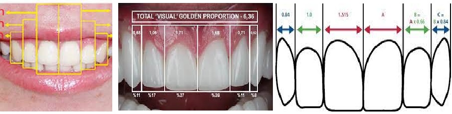نسبت طلایی واقعی دندان های قدامی - ثنایای مرکزی: ثنایای جانبی: نیش - به ترتیب نسبت 1.618: 1.0: 0.618 را ایجاد می کند.