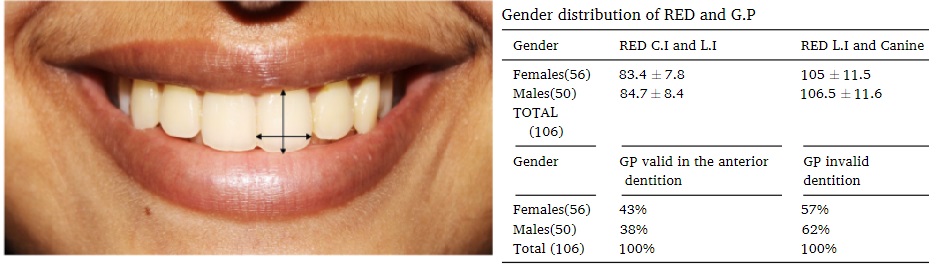 مقدار 69.5-70.3% که نسبت عرض دندانهای ثنایای جانبی فک بالا به عرض دندانهای مرکزی بود، با نسبت RED 70% پیشنهاد شده توسط وارد و میانگین نسبت پیشنهاد شده توسط فیاد و همکاران، مطابقت دارد. که بین 66 تا 78 درصد بود.